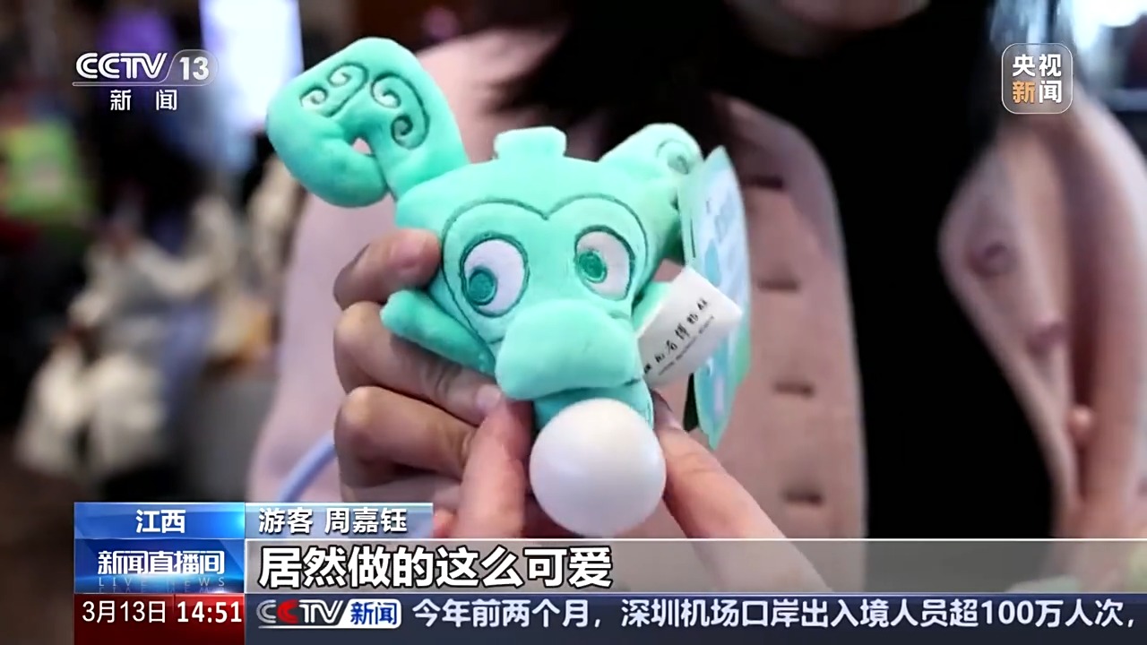 游客周嘉钰:我刚刚在展厅里面有看到这件文物,双面神人青铜面具,我觉得他特别威严,来店里一看,居然做这么可爱。